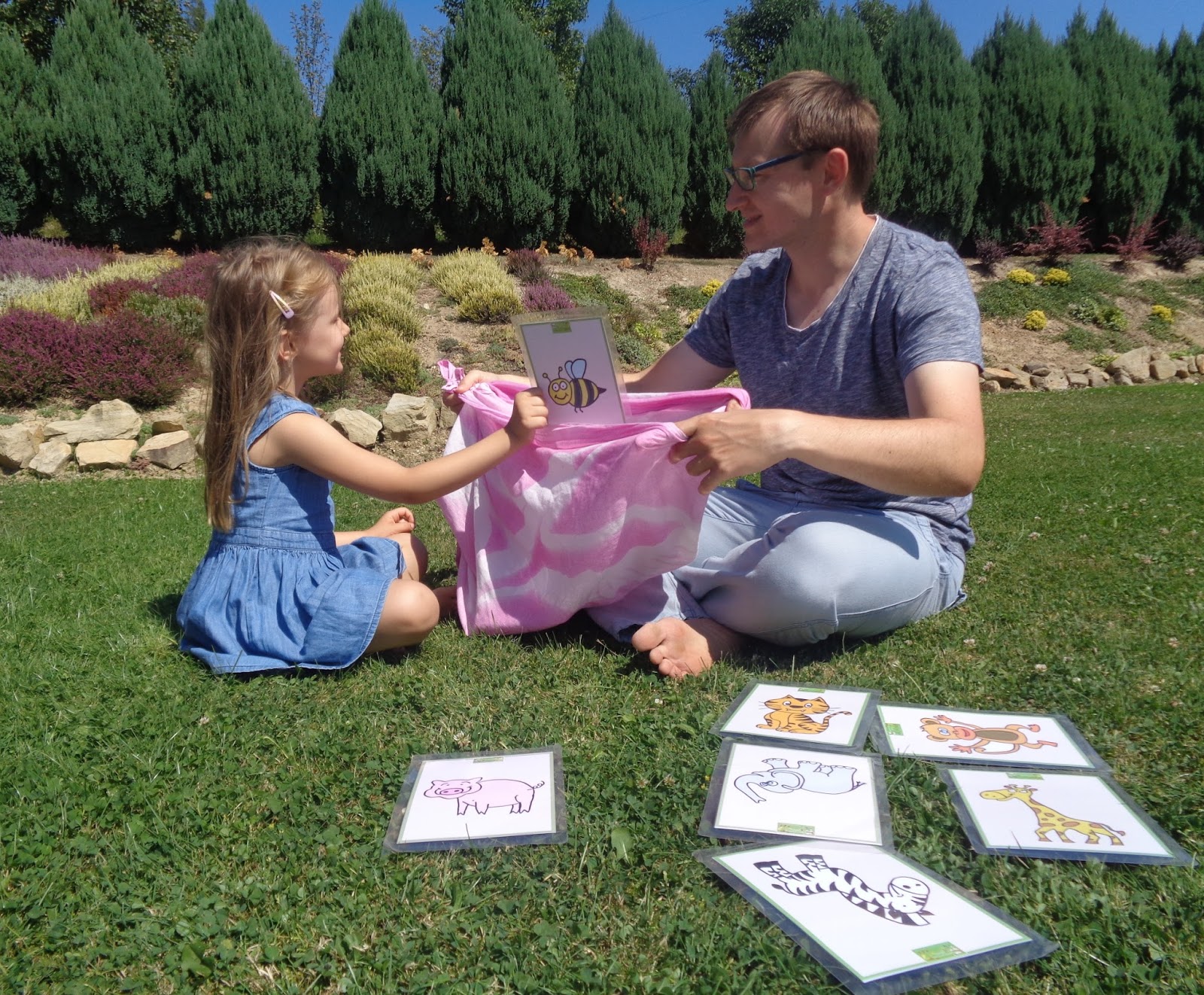 Do zabawy wykorzystuję kolorowe obrazki (flashcards) z rzeczami, które chcemy powtórzyć z dziećmi oraz mały kocyk.